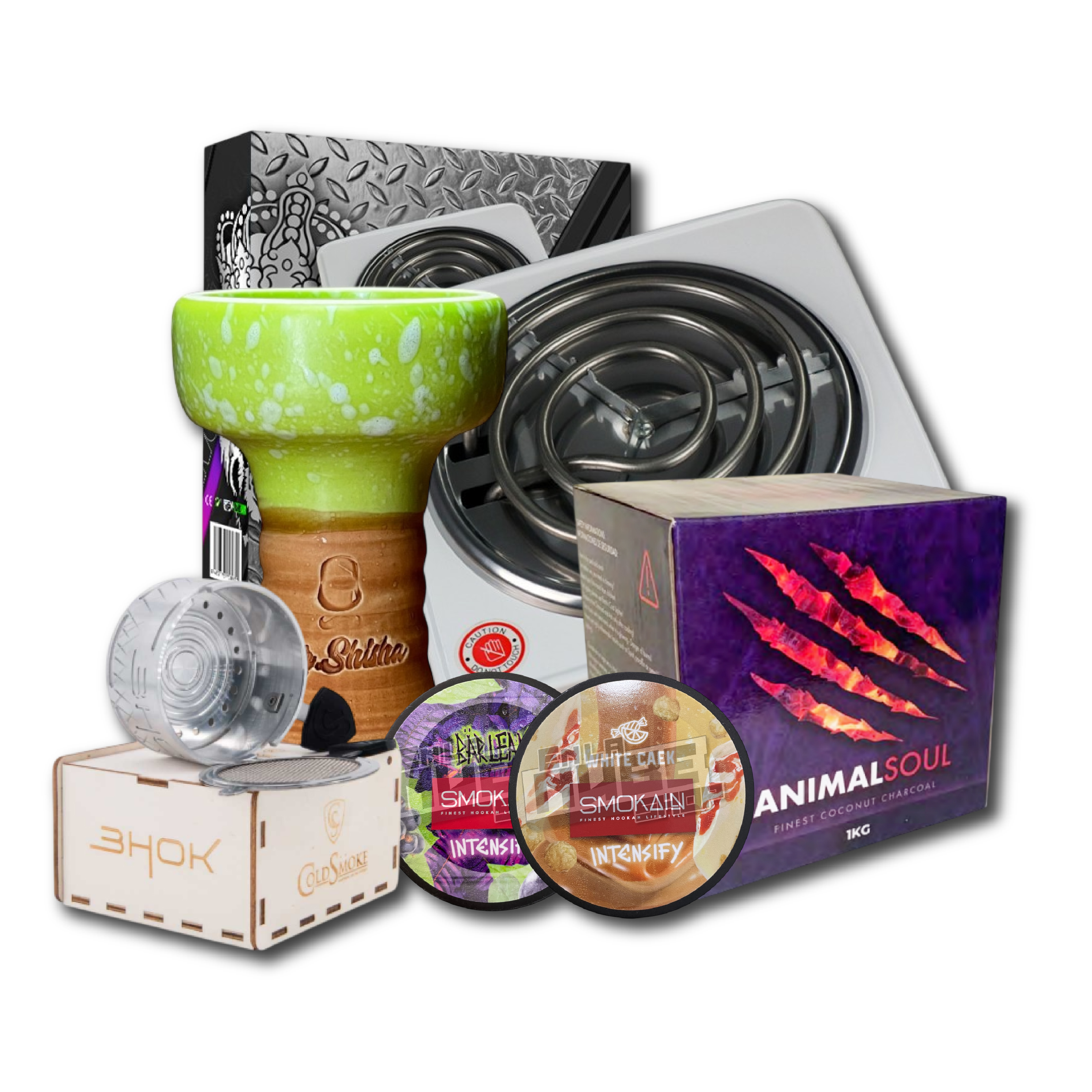 EL PACK TRADI INCLUYE: Cazoleta Mr. Shisha Atlas Hornillo King Coco 1000w Color aleatorio 1kg de carbón Animalsoul 26x26x26mm 2 esencias Smokain aleatorias 1 gestor de calor Bhok