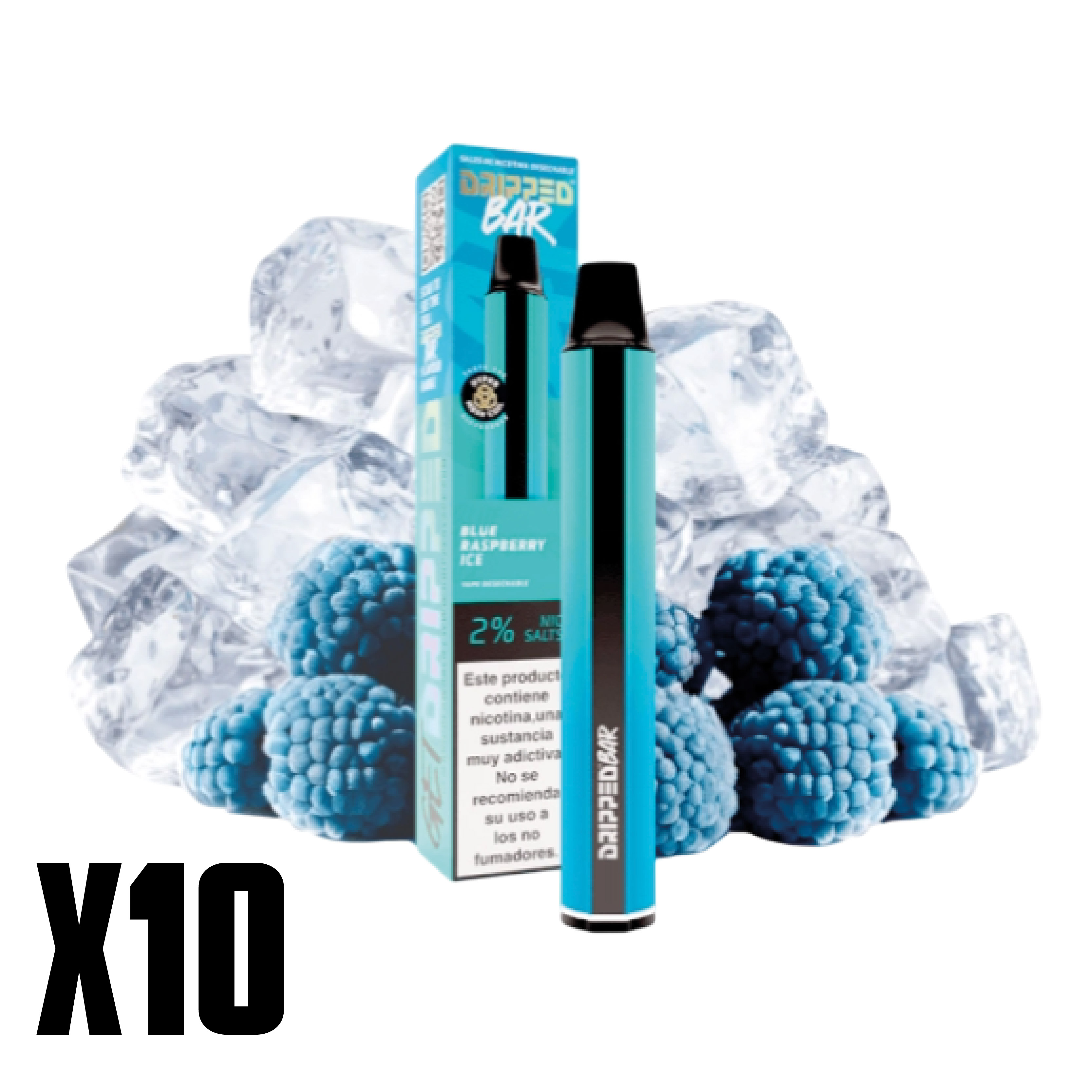 Caja de 10 unidades. El Dripped Bar Disposable Blue Raspberry Ice 20mg, sabor a frambuesa azul. Combina el toque ligeramente ácido y vibrante de las frambuesas con un toque de hielo refrescante.